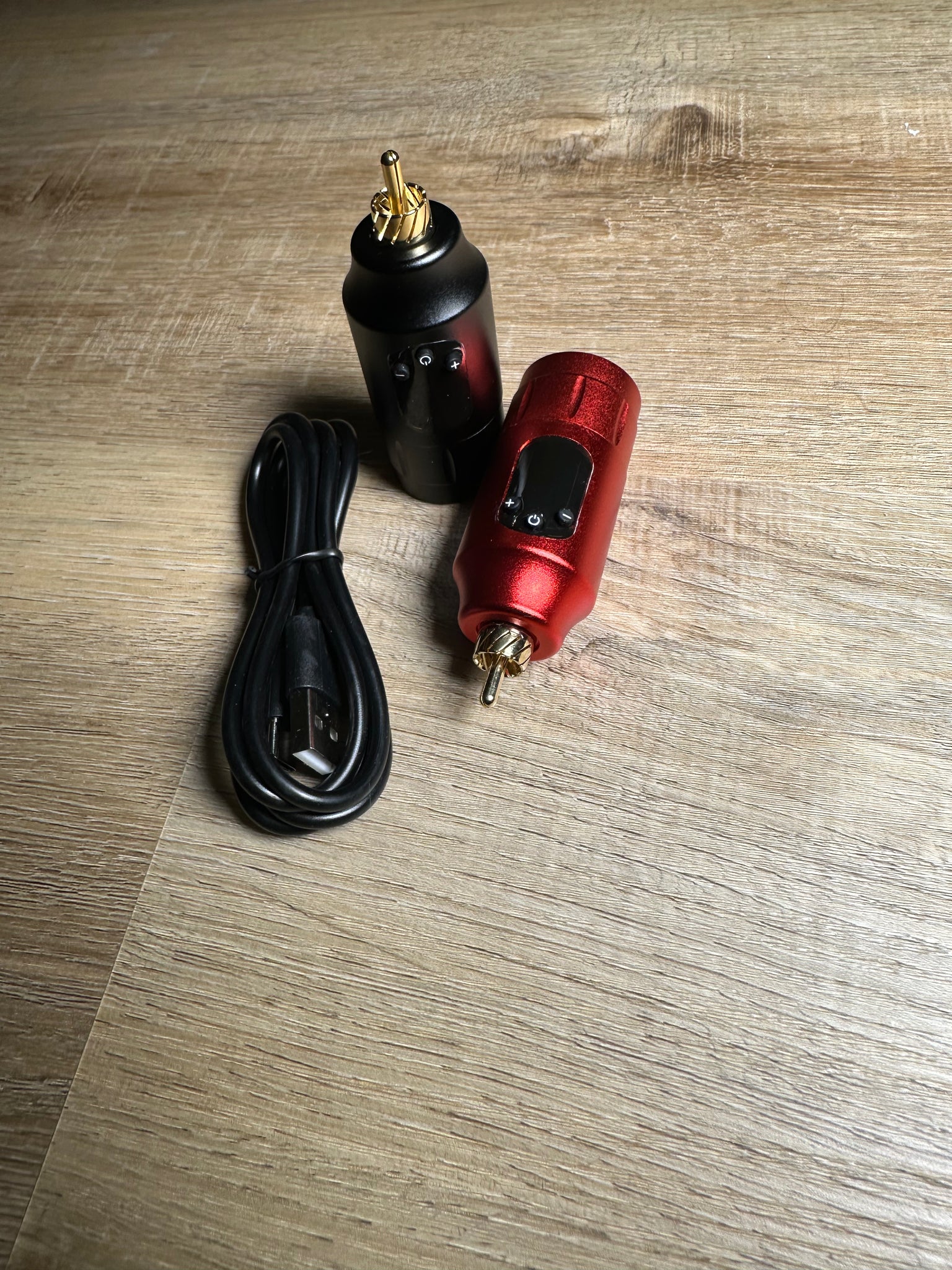 Wireless tattoo battery pack . Digital screen for easy voltage reading . Compatible with any RCA machine pen style or rotary. Available in red or black . Each battery pack comes with a charging cord .Charge up to 6 hours for maximum power of 8 hours at a time.